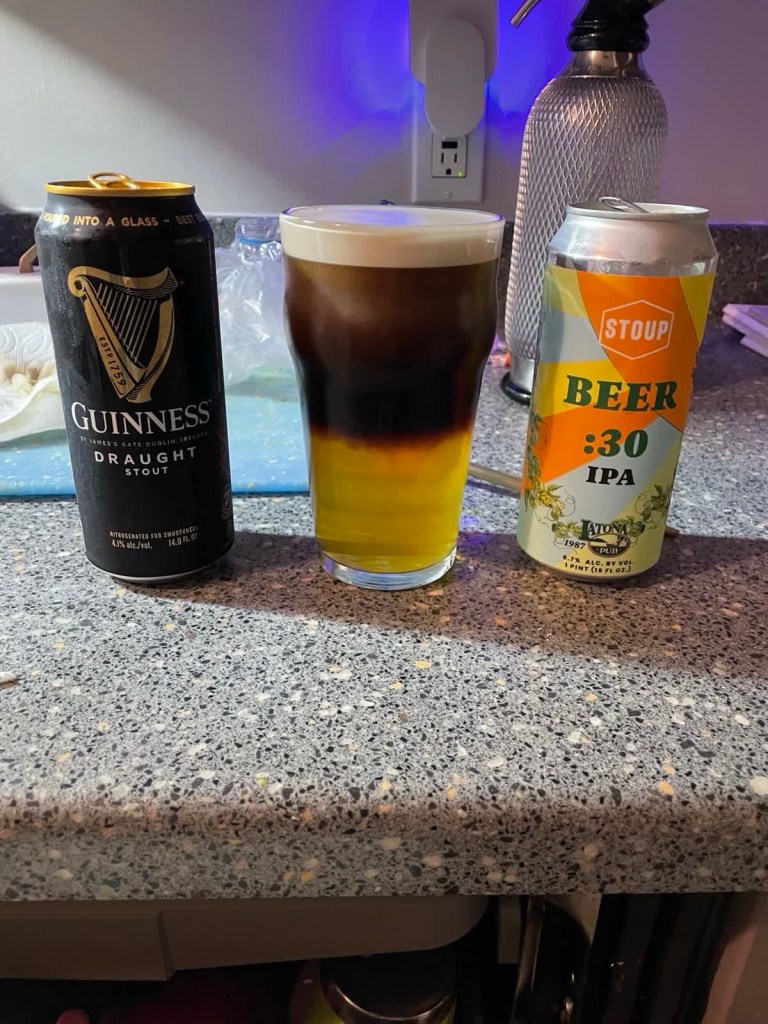 I came up with a new mix this morning (yea I said morning. Sue me.) Meet the Irish Lumberjack, a PNW fresh hop IPA with a layer of Guiness smoothed over the top. Beautiful.